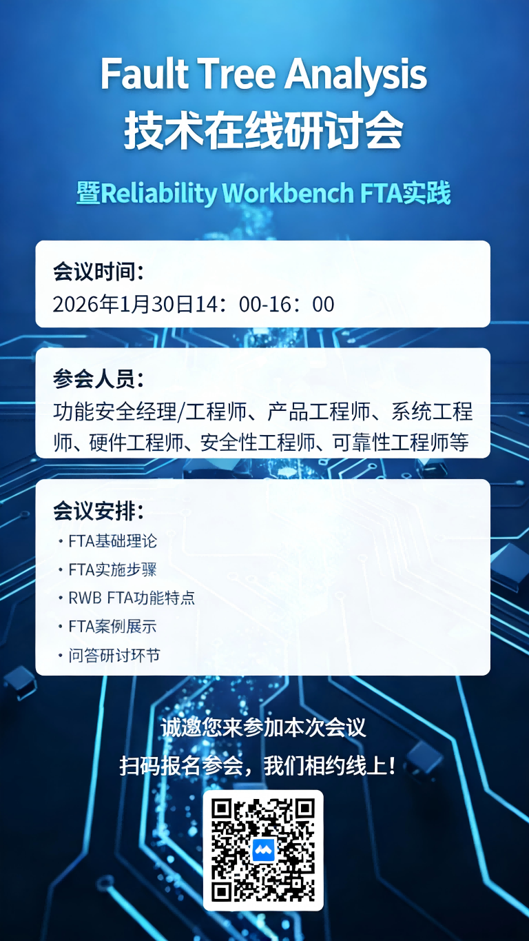 我公司将于 2026 年 1 月 30 日(星期五)14:00–16:00 举办 Fault Tree Analysis(故障树分析)技术在线研讨会。我们诚挚邀请您拨冗参会,与行业专家一同交流 Fault Tree Analysis 在系统可靠性、安全性分析中的应用与实践经验。扫描下方二维码完成报名,报名通过后即可获取参会链接,期待与您在线上相聚!
